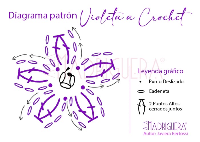 El diseño consta de dos pasos: primero tejeremos las flores, y luego la base compuesta por dos hojas. Finalmente, uniremos todas las piezas para formar tu ramo de violetas.