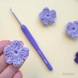 Repite el pétalo 4 veces más, para obtener un total de 5 pétalos. Una vez finalices, corta la hebra.
